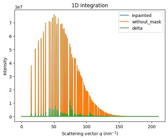 print("Between masked and non masked image R= %s"%pyFAI.utils.mathutil.rwp(wm,wo))