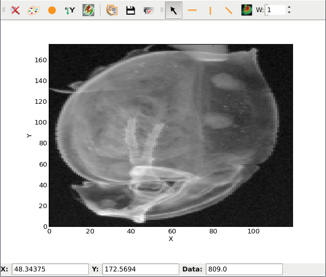 StackView is a widget designed to display an image from a stack of images in a PlotWindow widget, with a frame browser to navigate in the stack. The profile tool can do a 2D profile on the stack of images.