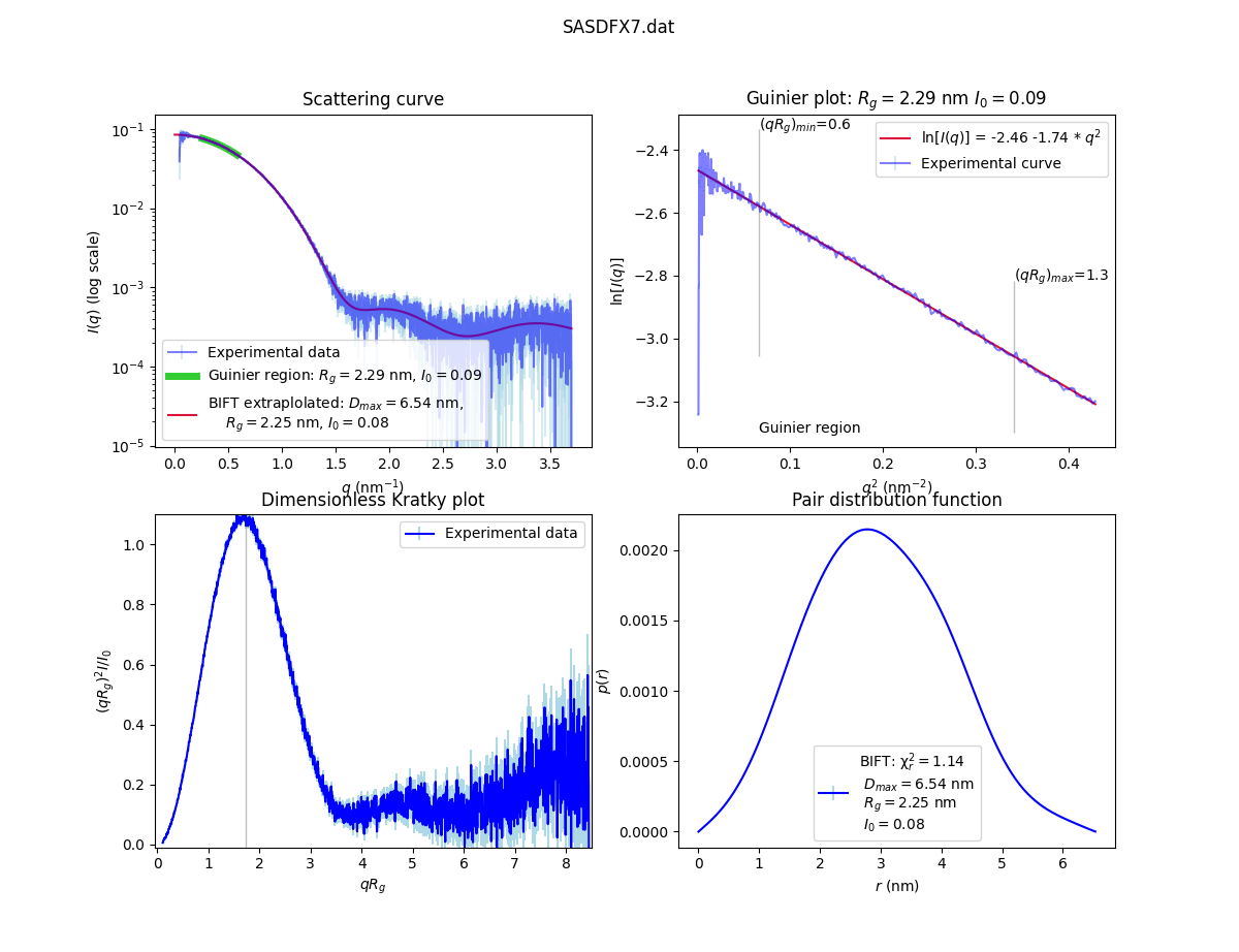 FreeSAS provides also a few useful tools to display and manipulate SAS data. The freesas program is performing Guinier, Kratky and BIFT and displays a graphic which should allow the visual data quality assessement.