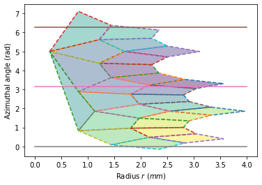 This tutorial presents how pixels are located in polar space and explains why pixels on the azimuthal discontinuity requires special care. It also presents a comparison between the 4 pixel splitting schemes available in pyFAI: without splitting (no), along the bounding box (bbox), a scaled down bounding box (pseudo) and finally the splitting along the edges of each pixel (full). The corresponding runtimes are also provided.