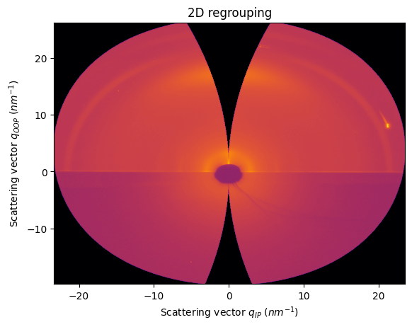 Now, PyFAI provides the units to represent a data array as a function of in-plane and out-of-plane components of vector q. This is a standard way of represent GIWAXS/GISAXS patterns. For the moment, incident_angle and tilt_angle are set to 0.0. While usually, the tilt_angle is corrected at the beginning of the experiment (so 0.0 is desired), the incident_angle is a key parameter during a GI experiment. However, for shallow angles (<1 degrees), a representation of the pattern using 0.0 is usually accurate enough.