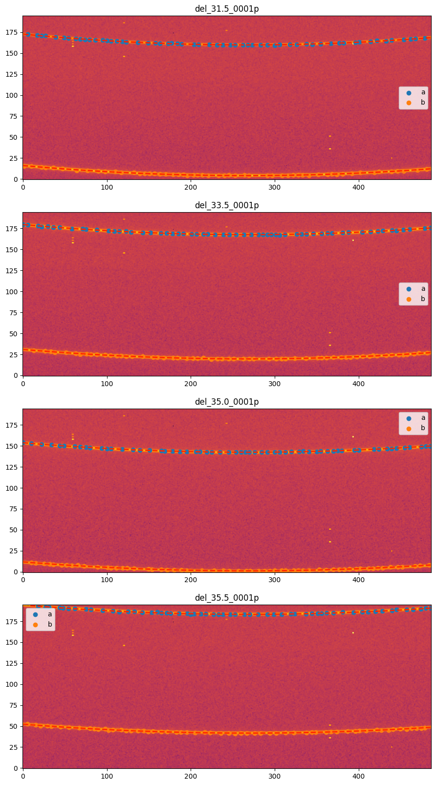 A prior manual calibration (using pyFAI-calib) has been performed on four images locate at 31.5, 33.5, 35 and 35.5 degrees. Those images were the first with two rings. The control points extrated during this initial calibration has been used as a starting point for this calibration. Then more images have been added to make the model more robust.