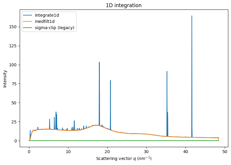 Two methods are readily available in pyFAI, they perform filtering the 2D regrouped image along a vertical axis: * median filtering: simple median along azimuthal angle (described in the before-mentionned article from 2013) * sigma clipping: iterative removal of all pixels above n standard deviation, this enforces a normal distribution