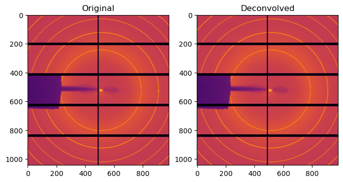 We will now correct the images of the first notebook called “goniometer” with the sparse matrix calculated in the second one (called “raytracing”) and check if the pick-width is less chaotic and if peaks are actually thinner.