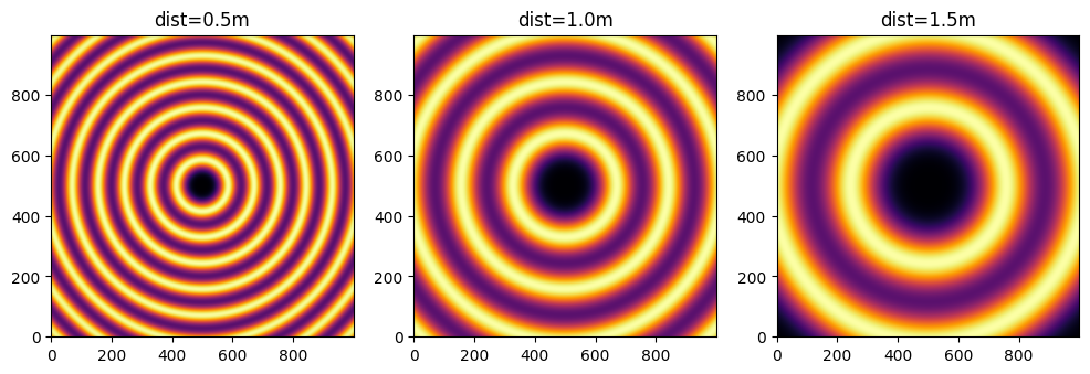 This image is the same as the one with dist=1.5m The positive distance along the d3 direction is equivalent to increase the distance. d3 is in the same direction as the incoming beam.