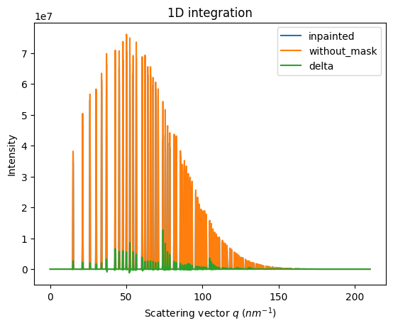 print("Between masked and non masked image R= %s"%pyFAI.utils.mathutil.rwp(wm,wo))