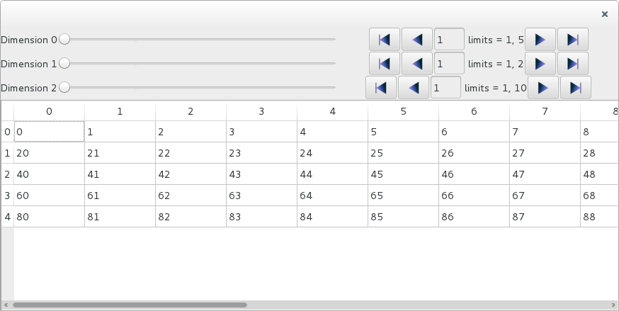 What we see now is a frame of 5 x 20 values, and the browser now browses the second dimension to select one of 10 available frames. The label is updated accordingly to show Dimension 1.